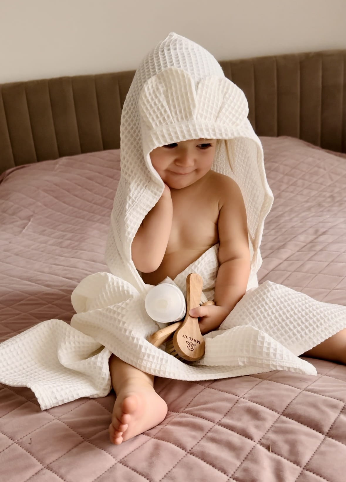 Nasze wyjątkowe ręczniki dziecięce szyjemy z 100% tkaniny bawełnianej wafel. Jest ona lekko grubsza, dzięki czemu ręcznik z waflowej tkaniny szybko wchłonie wilgoć! Jest to idealne okrycie dla maluszków z kapturkiem i uroczymi misiowymi uszkami. Ręczniki z tkaniny waflowej są niezwykle delikatne oraz bardzo chłonne. Ręczniczek waflowy uszyty jest z certyfikowanej tkaniny, dzięki czemu jest bezpieczny dla delikatnej skóry noworodków i dzieci. Posiada uroczy kapturek, który ochroni główkę przed chłodem po kąpieli lub na basenie czy na plaży.