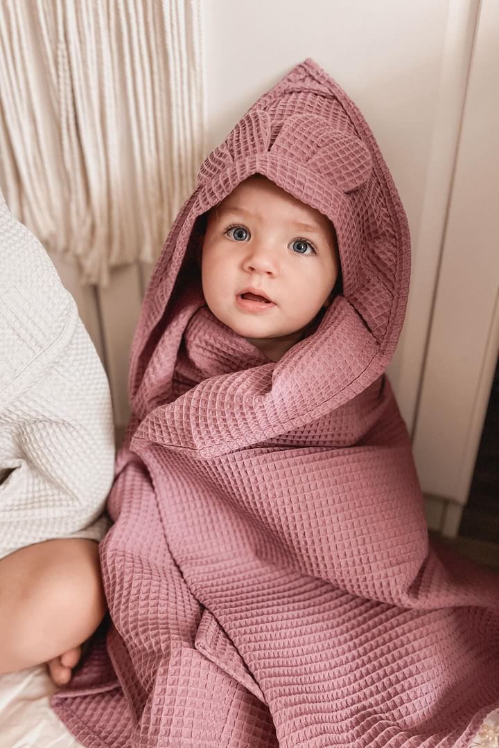 Nasze wyjątkowe ręczniki dziecięce szyjemy z 100% tkaniny bawełnianej wafel. Jest ona lekko grubsza, dzięki czemu ręcznik z waflowej tkaniny szybko wchłonie wilgoć! Jest to idealne okrycie dla maluszków z kapturkiem i uroczymi misiowymi uszkami. Ręczniki z tkaniny waflowej są niezwykle delikatne oraz bardzo chłonne. Ręczniczek waflowy uszyty jest z certyfikowanej tkaniny, dzięki czemu jest bezpieczny dla delikatnej skóry noworodków i dzieci. Posiada uroczy kapturek, który ochroni główkę przed chłodem po kąpieli lub na basenie czy na plaży.