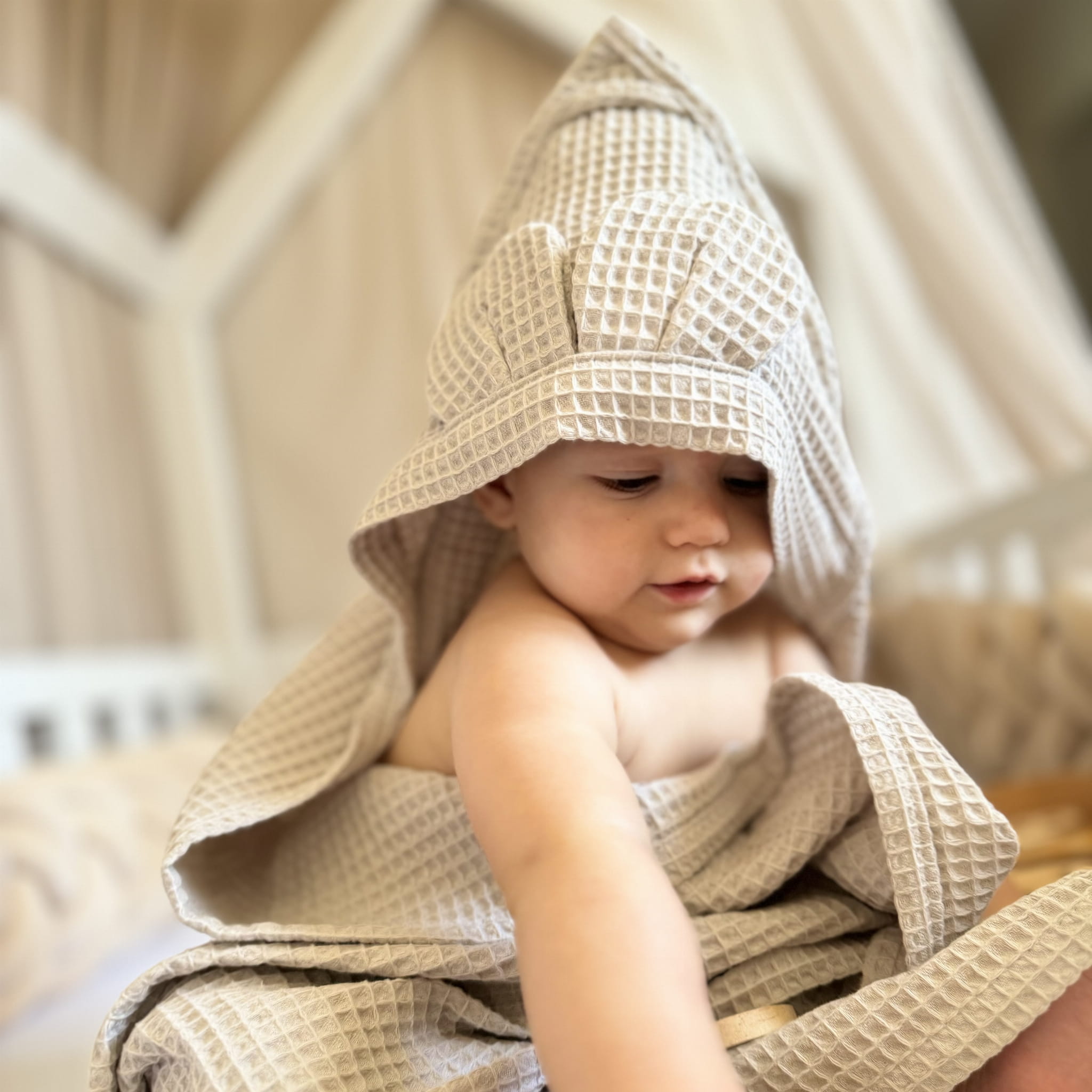 Nasze wyjątkowe ręczniki niemowlęce szyjemy z 100% tkaniny bawełnianej wafel. Idealne okrycie dla maluszków z uroczymi misiowymi uszkami. Ręczniki z tkaniny waflowej są niezwykle delikatne oraz bardzo chłonne. Ręczniczek waflowy uszyty jest z certyfikowanej tkaniny, dzięki czemu jest bezpieczny dla delikatnej skóry noworodków i dzieci. Posiada uroczy kapturek, który ochroni główkę przed chłodem po kąpieli lub na basenie czy na plaży.