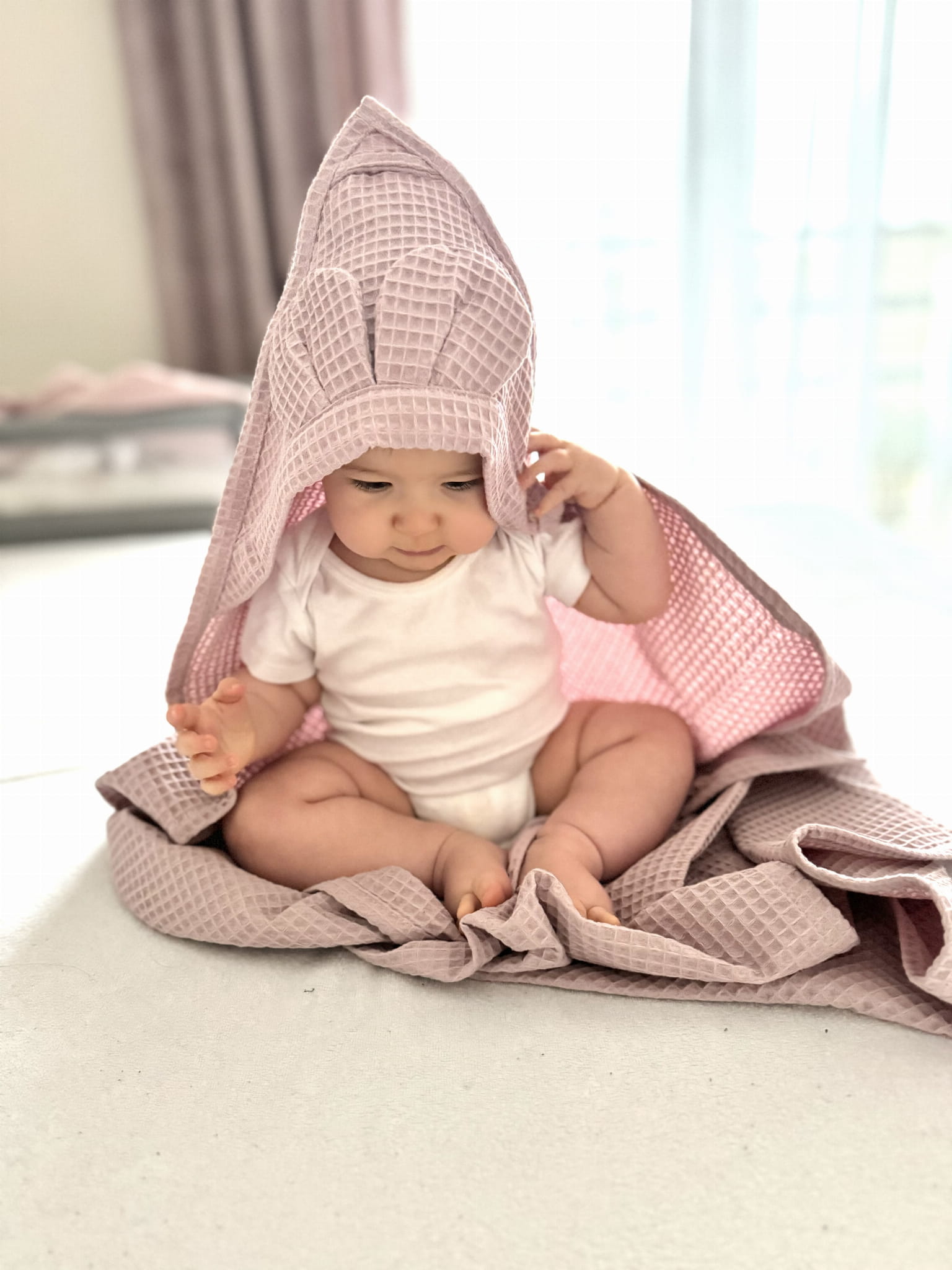 Nasze wyjątkowe ręczniki niemowlęce szyjemy z 100% tkaniny bawełnianej wafel. Idealne okrycie dla maluszków z uroczymi misiowymi uszkami. Ręczniki z tkaniny waflowej są niezwykle delikatne oraz bardzo chłonne. Ręczniczek waflowy uszyty jest z certyfikowanej tkaniny, dzięki czemu jest bezpieczny dla delikatnej skóry noworodków i dzieci. Posiada uroczy kapturek, który ochroni główkę przed chłodem po kąpieli lub na basenie czy na plaży.