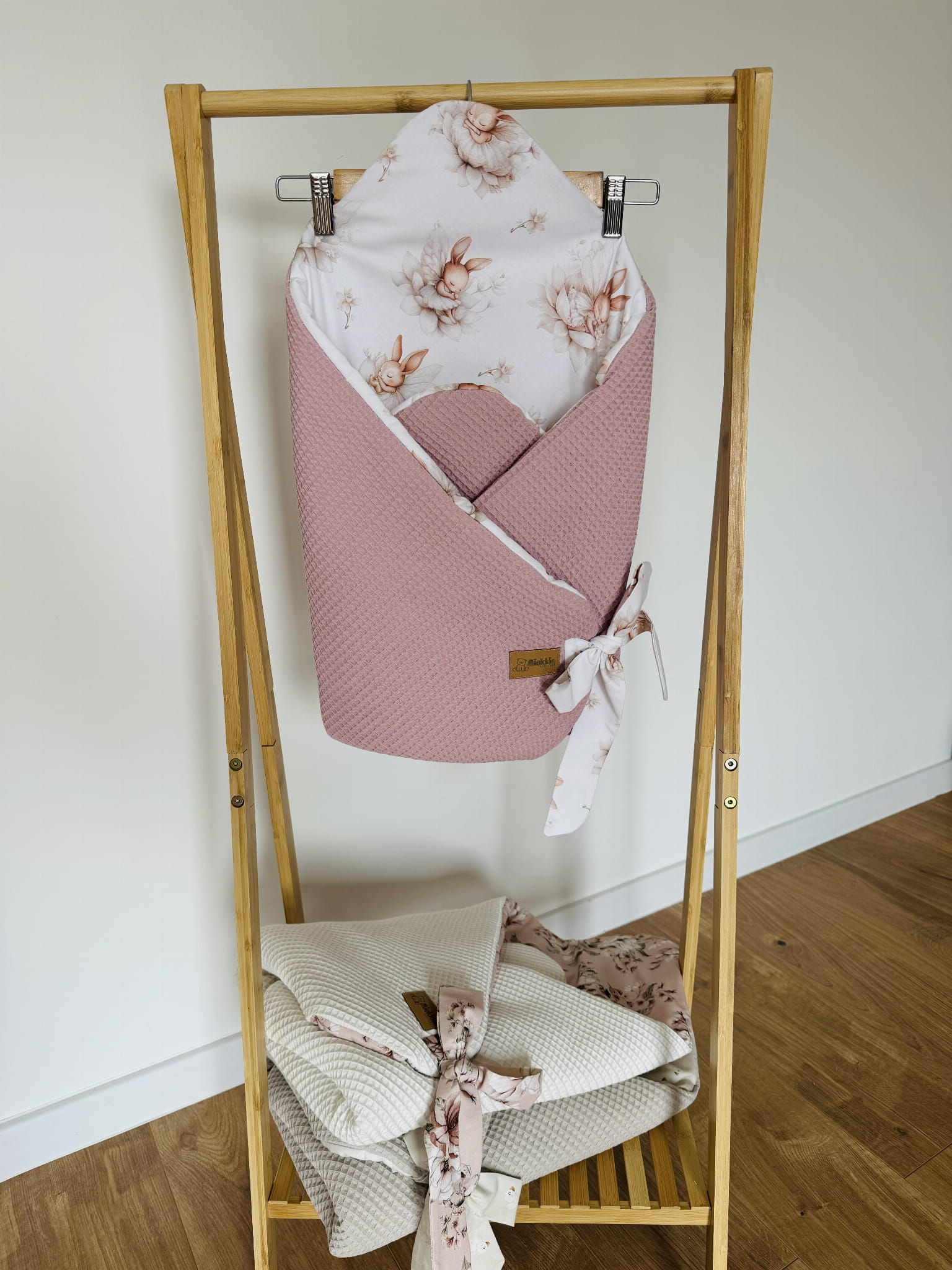 Rożek posiada praktyczne wiązania, które umożliwiają łatwe dopasowanie do ciała maluszka, zapewniając mu stabilność i bezpieczeństwo. Dzięki starannemu wykonaniu i naturalnym tkaninom, rożek jest nie tylko funkcjonalny, ale również bezpieczny dla wrażliwej skóry niemowlaka.